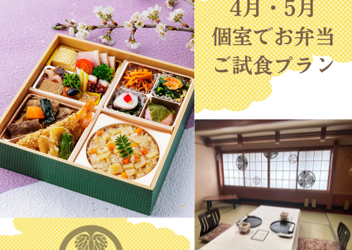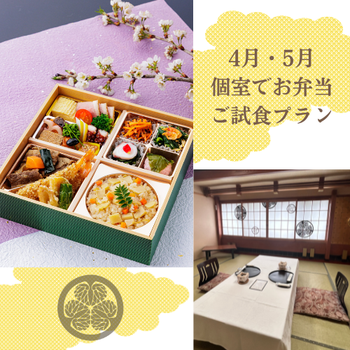 お昼限定、宅配弁当のご試食プランをご用意いたしました。 料亭の個室にて、ゆったりとお過ごしいただきながらお召し上がりいただけます。 4月・5月は、春季限定のお弁当【春薫(はるか)】をご用意。 料理長自慢の出汁が香るお吸...