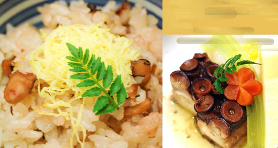 蛸は「柔らか煮、蛸天婦羅、蛸飯」でお楽しみいただきます。