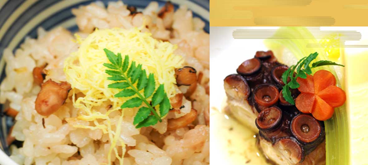 蛸は「柔らか煮、蛸天婦羅、蛸飯」でお楽しみいただきます。